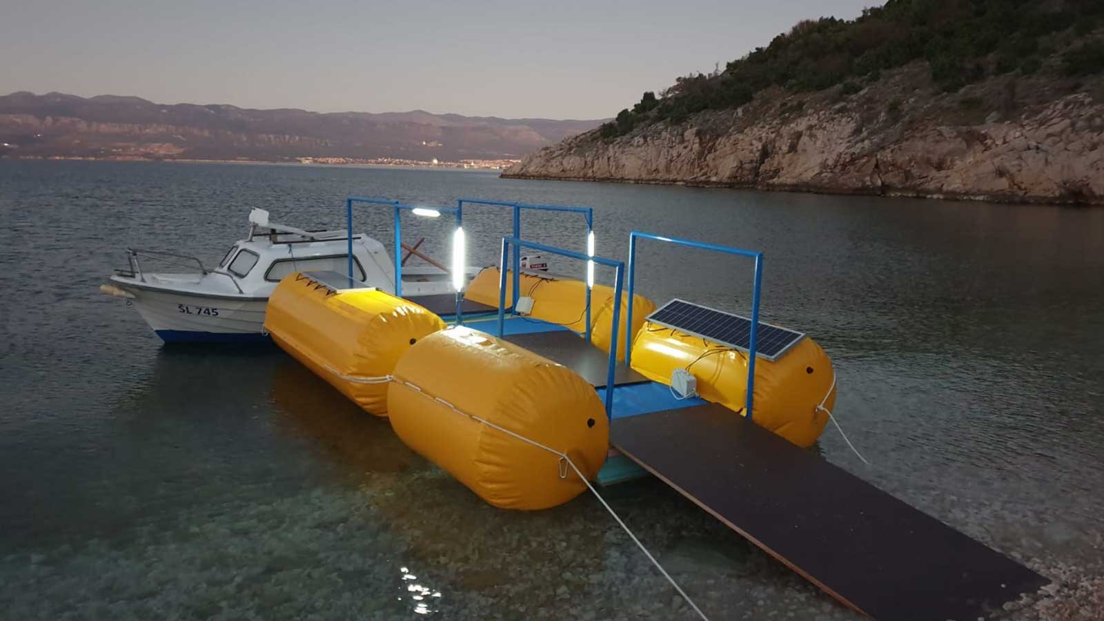 Pontoon, filled with foam, serves as a connection stabilizer on the water. A tread is attached on it as a base for a metal frame which is layed on top. Metal fence isused as a safety feature and for stabilization purpose, so people won’t fall in water and hurt themselves. D-connection ring is welded on plastic pipes to create a mobile connection to the shore. Solar panels are used to power and illuminate mobile berth for navigational safety.